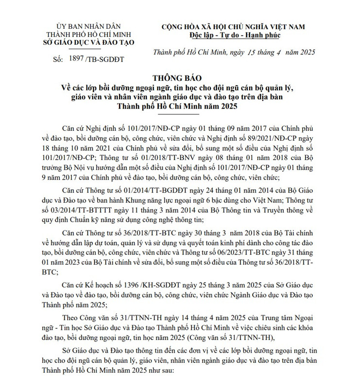 Cụ thể, giáo viên một số trường phổ thông ở Thành phố Hồ Chí Minh đã nhận được Thông báo số 1897/TB-SGDĐT ngày 15/4/2025 của Sở Giáo dục và Đào tạo Thành phố về các lớp bồi dưỡng ngoại ngữ, tin học cho đội ngũ cán bộ quản lý, giáo viên và nhân viên ngành giáo dục và đào tạo.