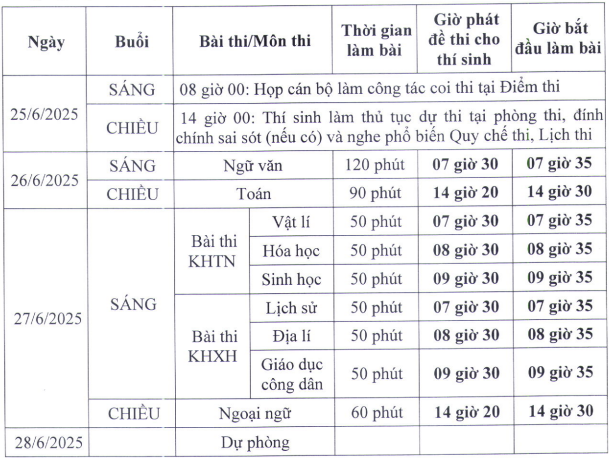 Từ ngày 21/4 đến 17 giờ ngày 28/4/2025: thí sinh lớp 12 thực hiện đăng ký dự thi và đăng ký xét tốt nghiệp trung học phổ thông trực tuyến; thí sinh tự do đăng ký trực tuyến rồi in và nộp phiếu đăng ký dự thi cho đơn vị đăng ký dự thi.