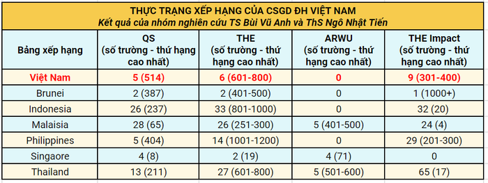 Ngoài ra, nhóm tác giả cũng thực hiện đối sánh về số lượng trường xếp hạng và vị trí của xếp hạng của Việt Nam so với một số trường trong khu vực.