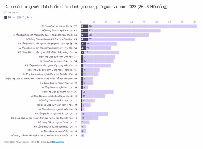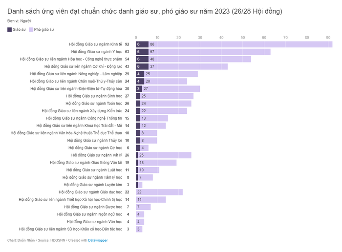 Theo danh sách này, Kinh tế là ngành có đông ứng viên được công nhận chức danh giáo sư và phó giáo sư nhất năm nay, với 92 người; đứng thứ hai là ngành Y học với 63 người; ngành Hóa học - Công nghệ thực phẩm với 54 người, xếp thứ 3.