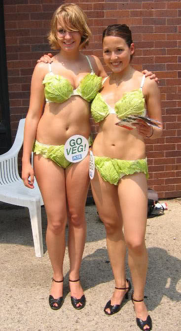 | Hai tình nguyện viên của tổ chức PETA với chiếc áo ngực bằng rau cải bắp. Ảnh. David Snyder. |
