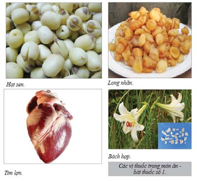 Bài 1: Tim lợn 1 quả, hạt sen 30g, long nhãn 15g, bạch hợp 30g, gia vị vừa đủ. Tim lợn loại bỏ phần mỡ, rửa sạch, thái mỏng; hạt sen bỏ tâm, bách hợp và long nhãn rửa sạch. Tất cả cho vào nồi, đổ vừa nước, đun to lửa cho sôi rồi dùng lửa nhỏ hầm kỹ trong 1 giờ. Khi chín, chế đủ gia vị, ăn trong ngày. Nếu dùng hạt sen và bách hợp tươi thì càng tốt nhưng với lượng nhiều hơn một chút.