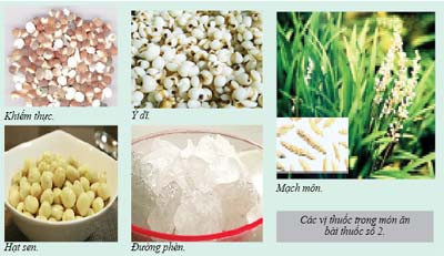 Bài 2: Khiếm thực 30g, ý dĩ 30g, mạch môn 30g, hạt sen 30g và đường phèn lượng vừa đủ. Hạt sen bỏ tâm, mạch môn không bỏ lõi, khiếm thực và ý dĩ rửa sạch, tất cả đem ngâm với nước sạch trong 20 phút. Sau đó, cho khiếm thực và ý dĩ và nồi, đổ đủ nước, đun to lửa cho sôi rồi dùng lửa nhỏ hầm nhừ chừng 30 phút.
