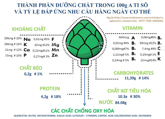 Trong 100g atisô (hoa) chứa khoảng 15 microgram Vitamin K, 90mcg Acxit folic (Folate), Vitamin C, magne, mangan, kali...