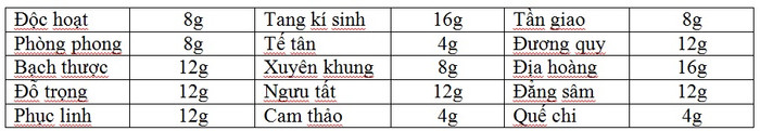 Bài thuốc Độc hoạt Tang kí sinh vốn là của tác giả Tôn Tư Mạo và được đăng trong cuốn “Bí cấp thiên kim yếu phương”. Bài thuốc này có tất cả 15 vị thuốc với liều lượng phối hợp như sau: