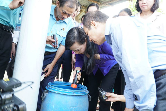 | Bộ trưởng Nguyễn Thị Kim Tiến thị sát tình hình phòng chống dịch sốt xuất huyết. |