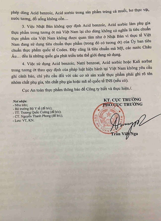 Cục An toàn thực phẩm cho biết: Acid benzoic (INS 210) và muối Natri benzoat (INS 211) cũng như Acid sorbic (INS 200) và Kali (INS 202) là các chất bảo quản được phép sử dụng trong sản phẩm tương ớt theo quy định tại Thông tư số 27/2012/TT-BYT ngày 30/11/2012 và Thông tư số 08/2015/TT-BYT ngày 11/05/2015 của Bộ Y tế về Hướng dẫn quản lý phụ gia thực phẩm với hàm lượng tối đa là 1.000mg/kg sản phẩm.