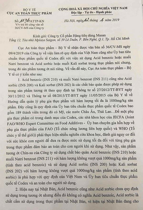 Công văn của Cục An toàn thực phẩm nêu rõ: "Sản phẩm tương ớt Chin-Su của Công ty sử dụng chất bảo quản Acid benzoic (INS 210) hoặc muối Natri Benzoat (INS 211) với hàm lượng không vượt quá 1.000mg/kg sản phẩm (tính theo acid Benzoic) và sử dụng Acid sorbic (INS 200) hoặc Kali sorbat (INS 202) với hàm lượng không vượt quá 1.000mg/kg sản phẩm (tính theo acid sorbic) là phù hợp với quy định của Việt Nam và Uỷ ban tiêu chuẩn thực phẩm quớc tế Codex và an toàn cho người sử dụng".