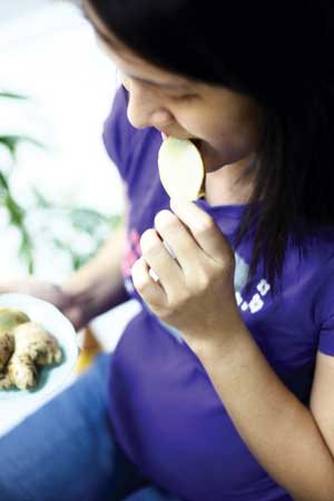 Ngoài ra, thai phụ có thể sử dụng các loại thực phẩm có tác dụng làm giảm buồn nôn như gừng. Đã có rất nhiều nghiên cứu cho thấy gừng, uống ở dạng bột tinh chất (liều 1.000mg tinh bột khô mỗi ngày), dạng gia vị hay trà gừng, làm giảm rất hiệu quả tình trạng buồn nôn và nôn nhiều ở những thai phụ bị nghén nặng. Trong thực tế, gừng đã được sử dụng làm gia vị trong bữa ăn của nhiều nước từ hàng trăm năm nay. Hiện tại, nhiều hiệp hội sản phụ khoa uy tín như hiệp hội Sản phụ khoa Canada, Hoa Kỳ… đều khuyến khích sử dụng gừng để điều trị buồn nôn và nôn nhiều trong thai kỳ.
