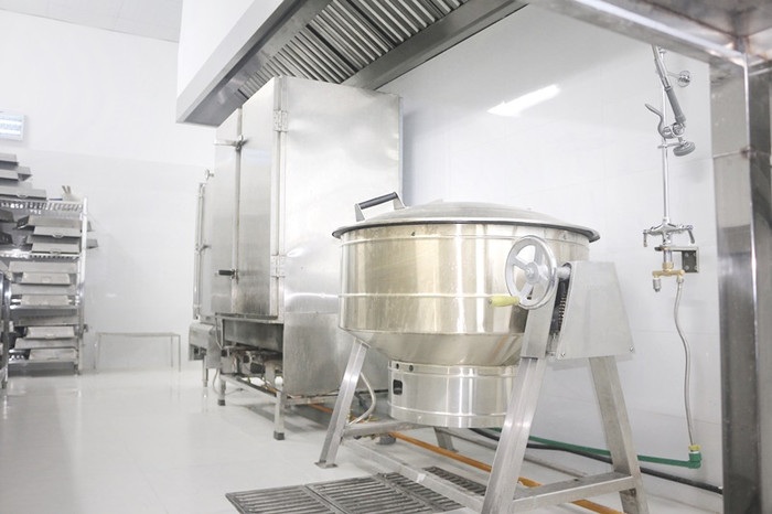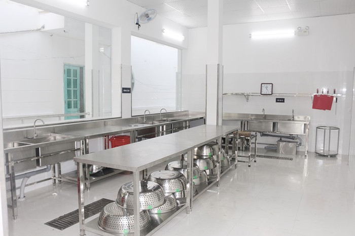 Bếp được trang bị các thiết bị, dụng cụ cần thiết và hiện đại như hệ thống bếp “niêu tay quay” và nồi hầm với công suất gấp 2 – 3 lần bếp ăn thông thường, hệ thống vòi nước di động cấp nước nhanh đến từng khu vực, xe đẩy trung chuyển… giúp giảm thiểu thao tác nặng trong công việc cũng như tiết kiệm thời gian cho nhân viên cấp dưỡng trong quá trình sơ chế, chế biến thực phẩm.
