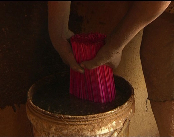“Tôi không biết tác hại đến đâu và như thế nào, nhưng cũng theo anh này, do công việc hàng ngày phải tiếp xúc với hóa chất, lại không có các dụng cụ bảo vệ như găng tay, nên bàn tay anh bị axit ăn mòn, nhìn như bị ghẻ lở. Anh bắt đầu làm hương từ năm 16 tuổi, đến nay cũng đã sống với nghề này được 5 năm rồi.