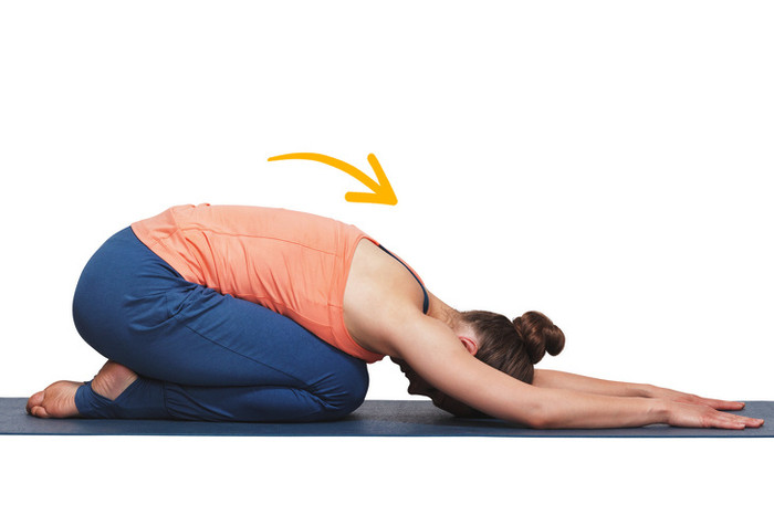 Cách thực hiện: Quỳ xuống và di chuyển đầu gối của bạn rộng ngang hông. Từ từ di chuyển phần thân trên của bạn về phía trước để cánh tay của bạn chạm vào bề mặt. Cố gắng duỗi cơ thể và đặt trán xuống.