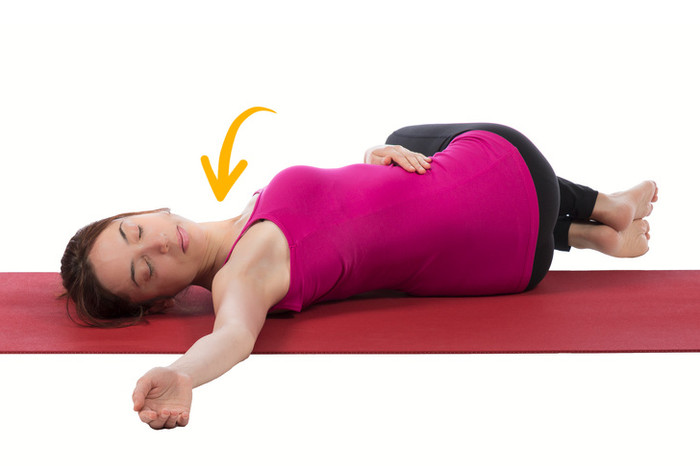 Cách thực hiện: Nằm xuống sàn một cách thoải mái. Gấp đầu gối của bạn và sau đó nghiêng cả hai sang một bên trong khi cố gắng di chuyển phần thân trên của bạn sang phía đối diện.
