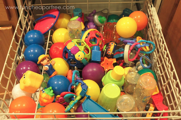 Thật cực nhọc khi phải rửa bằng tay tất cả những đồ chơi của nhóc tì nhà bạn? Có một cách tốt hơn nhiều đấy. Hãy gom hết tất cả đồ chơi trong nhà lại và bỏ vào máy rửa chén.