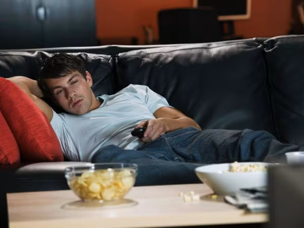 Một thói quen vô cùng xấu khiến bụng phệ ra. Thay vì nằm lười, hãy đi lại nhẹ nhàng hoặc ngồi thẳng tầm một tiếng trước khi nằm nghỉ để hệ tiêu hóa làm việc.