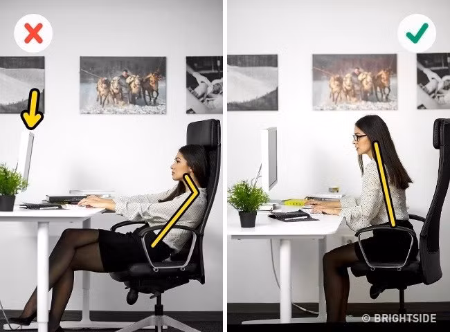 Nếu để mắt thấp hơn, cơ thể sẽ phải trượt xuống ghế, gây ảnh hưởng đến cột sống và lưu thông máu lên não. Nếu để cao hơn thì lưng uốn cong gây ảnh hưởng đến cột sống.