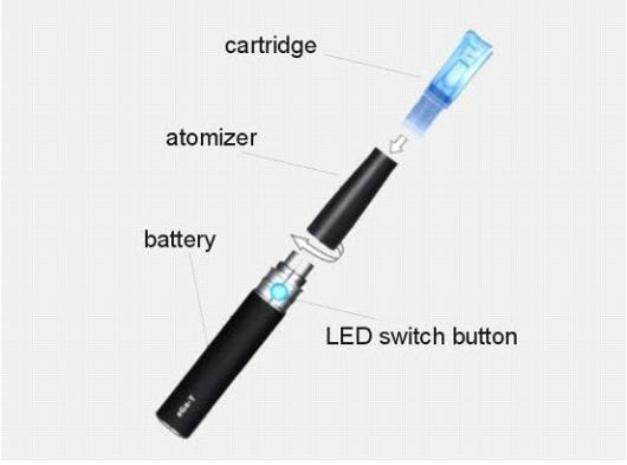 Một điếu thuốc lá điện tử gồm 3 bộ phận chính: Đầu pin, thân điếu là một bộ phận vi mạch có chức năng kích hoạt bộ phận phun hỗn hợp hơi lỏng ( buồng đốt) khi người hút hít vào – thở ra là dạng hơi, và bầu đựng tinh dầu.