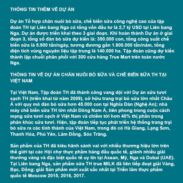 Trong đó riêng nhà máy với công suất chế biến 1.500 tấn/ngày sẽ trở thành nhà máy có công suất lớn nhất nước Nga, sử dụng hoàn toàn nguồn nguyên liệu sữa tươi từ trang trại bò sữa TH tại Moscow và Kaluga.