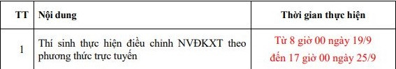 Từ 8h00 ngày 19/9 đến 17h00 ngày 25/9, thí sinh sử dụng tài khoản và mật khẩu cá nhân đã được cấp để điều chỉnh nguyện vọng đăng ký xét tuyển bằng phương thức trực tuyến, dùng mã OTP để xác nhận việc điều chỉnh nguyện vọng.