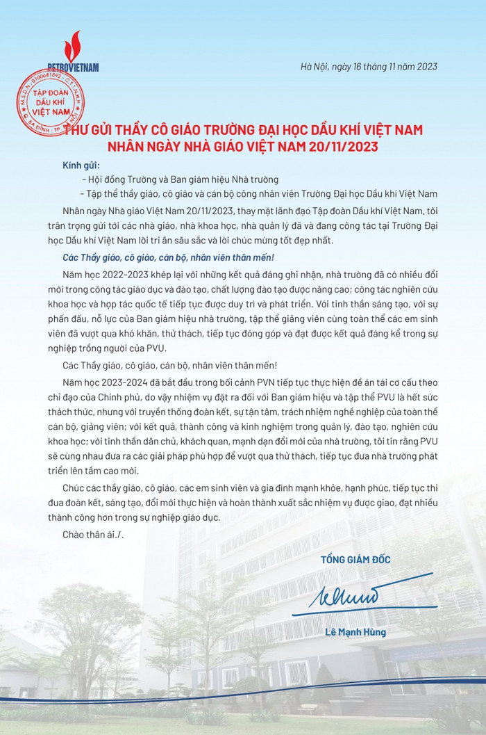 Nhân ngày Nhà giáo Việt Nam 20/11, ngày tôn vinh và tri ân các thầy giáo, cô giáo, thể hiện truyền thống “Tôn sư trọng đạo” của dân tộc, thay mặt Đảng ủy, Hội đồng Thành viên, Ban Tổng Giám đốc Tập đoàn Dầu khí Việt Nam (Petrovietnam), Tổng Giám đốc Lê Mạnh Hùng đã có thư chúc mừng gửi tới Hội đồng Trường, Ban Giám hiệu, tập thể thầy giáo, cô giáo và cán bộ, nhân viên Trường Đại học Dầu khí Việt Nam (PVU).