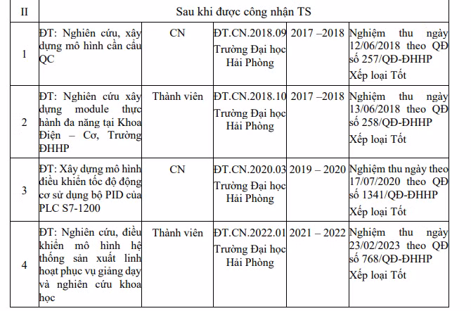 Bên cạnh đó, Phó Trưởng phòng Khảo thí và Đảm bảo chất lượng, Trường Đại học Hải Phòng cũng chủ trì hoặc tham gia xây dựng, phát triển chương trình đào tạo hoặc chương trình/dự án/đề tài nghiên cứu, ứng dụng khoa học công nghệ của cơ sở giáo dục đại học đã được đưa vào áp dụng thực tế.