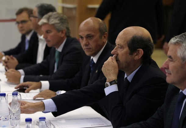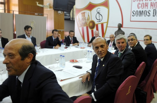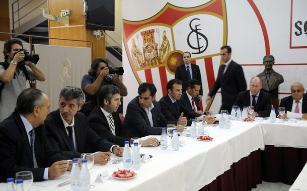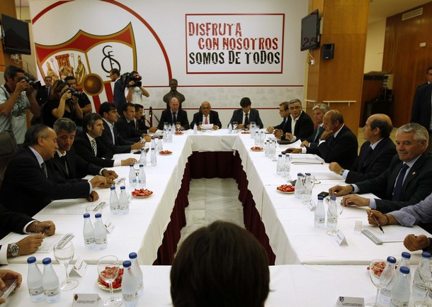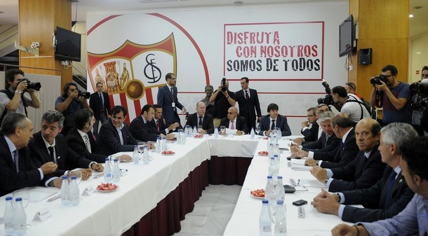 | 12 CLB ở La Liga họp tại Ramon Sanchez Pizjuan (Sevilla) để chống lại sự độc quyền của Barca và Real trong vấn đề bản quyền truyền hình. |