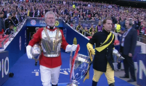- Paul Breitner mặc giáp, Lars Ricken mặc đồng phục sĩ quan để mang cúp ra sân.