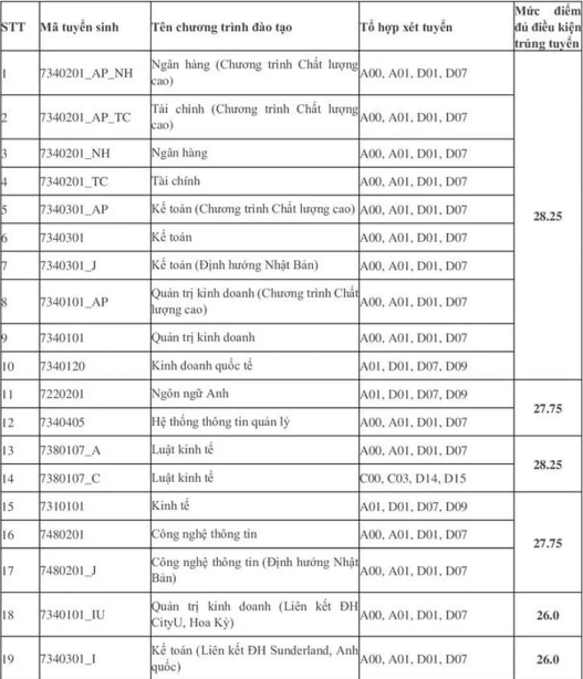 Ngoài Trường Đại học Kinh tế Quốc dân và Học viện Công nghệ Bưu chính Viễn thông, Học viện Ngân hàng cũng công bố mức điểm trúng tuyển đối với các phương thức xét tuyển sớm là học bạ trung học phổ thông, chứng chỉ ngoại ngữ quốc tế và điểm thi đánh giá năng lực của Đại học Quốc gia Hà Nội.