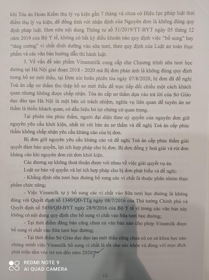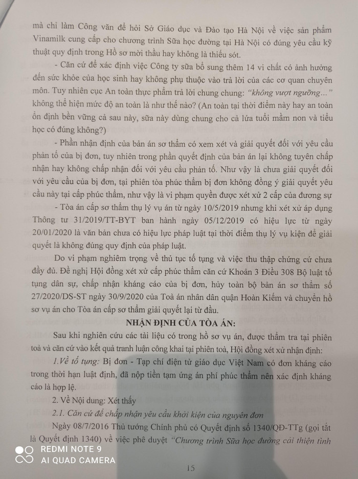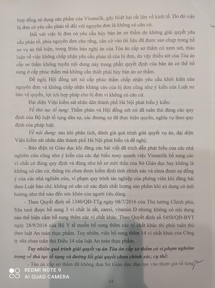 - Tòa án cấp sơ thẩm đã không đưa Sở Giáo dục đào tạo vào tham gia tố tụng mà chỉ làm Công văn để hỏi Sở Giáo dục và Đào tạo Hà Nội về việc sản phẩm Vinamilk cung cấp cho chương trình Sữa học đường tại Hà Nội có đúng yêu cầu kỹ thuật quy định trong Hồ sơ mời thầu hay không là thiếu sót.