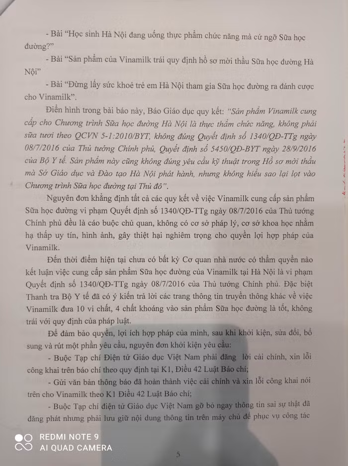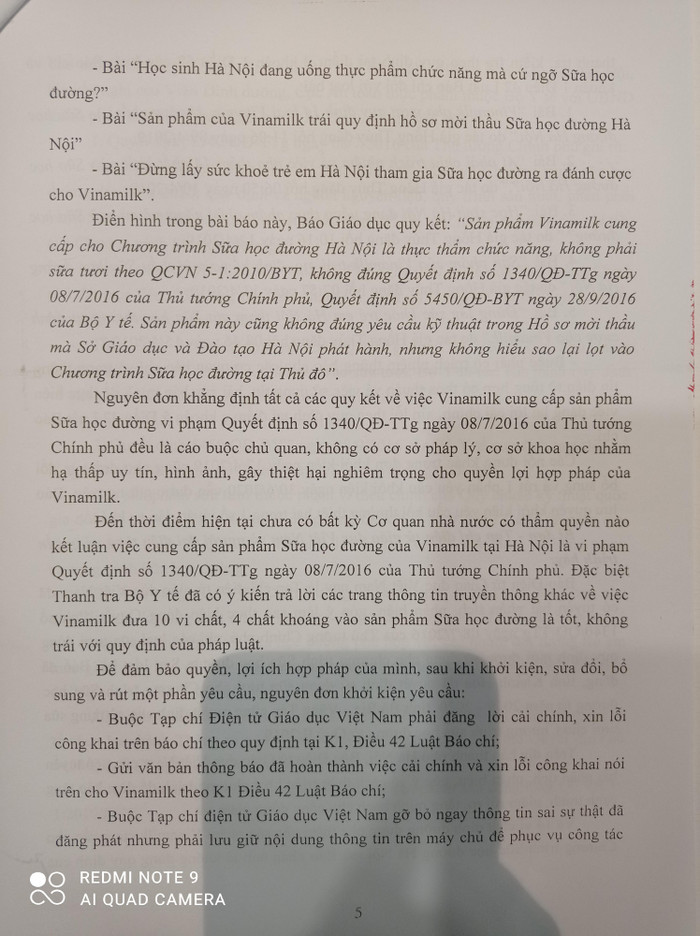 Báo điện tử Giáo dục Việt Nam đã đăng các bài báo, với nội dung quy kết chủ quan, sai sự thật cho rằng sản phẩm Sữa tươi học đường do VINAMILK cung cấp cho Chương trình Sữa học đường Hà Nội vi phạm Quyết định số 1340/QĐ-TTg ngày 08/07/2016 của Thủ tướng Chính phủ. Các quy kết này gây hoang mang trong nhân dân, khiến dư luận hiểu sai sự thật về sản phẩm của VINAMILK, xâm hại danh dự, uy tín, hình ảnh của VINAMILK và gây thiệt hại trực tiếp tới quyền lợi vật chất của VINAMILK khi đồng loạt các phụ huynh, Nhà trường tạm ngừng việc cho học sinh sử dụng sữa học đường, doanh số kinh doanh của VINAMILK giảm sút rõ rệt. Các bài báo có nội dung quy kết gồm: