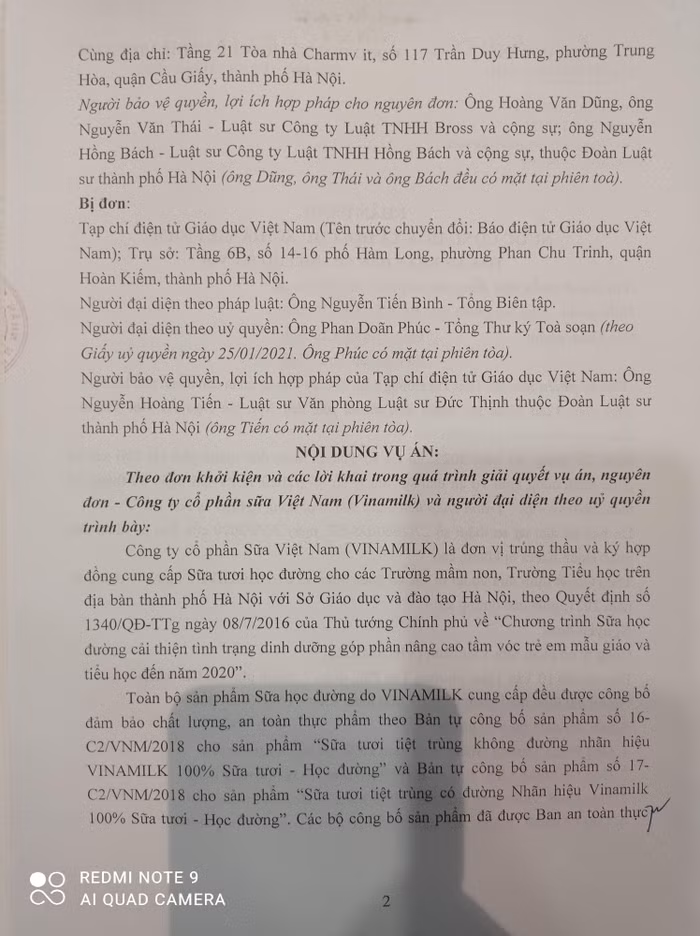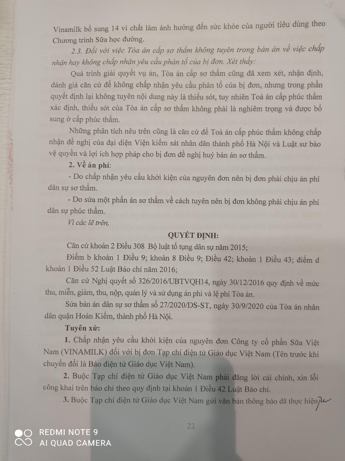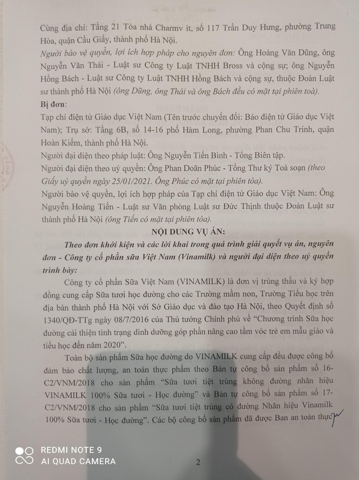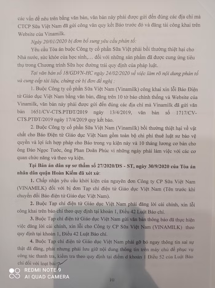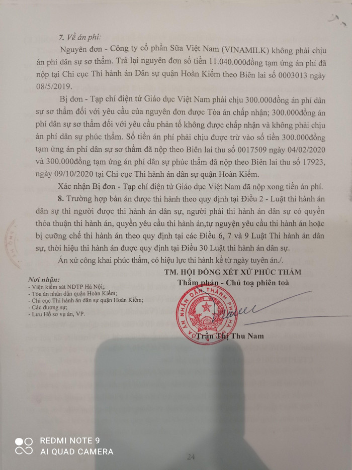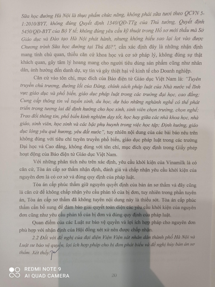 Sau khi Công ty Cổ phần Sữa Việt Nam khởi kiện Báo điện tử Giáo dục Việt Nam, Tòa án nhân dân quận Hoàn Kiếm đã thụ lý, đưa ra xét xử ngày 30/9/2020, Tòa án nhân dân thành phố Hà Nội xét xử phúc thẩm ngày 28/01/2021, trong đó tuyên xử: Chấp nhận yêu cầu khởi kiện của nguyên đơn Công ty Cổ phần Sữa Việt Nam (VINAMILK) đối với bị đơn Tạp chí điện tử Giáo dục Việt Nam (Tên trước khi chuyển đổi là Báo điện tử Giáo dục Việt Nam); Buộc Tạp chí điện tử Giáo dục Việt Nam phải đăng lời cải chính, xin lỗi công khai; Buộc Tạp chí điện tử Giáo dục phải gỡ bỏ ngay thông tin sai sự thật đã đăng trong 5 bài viết trên…