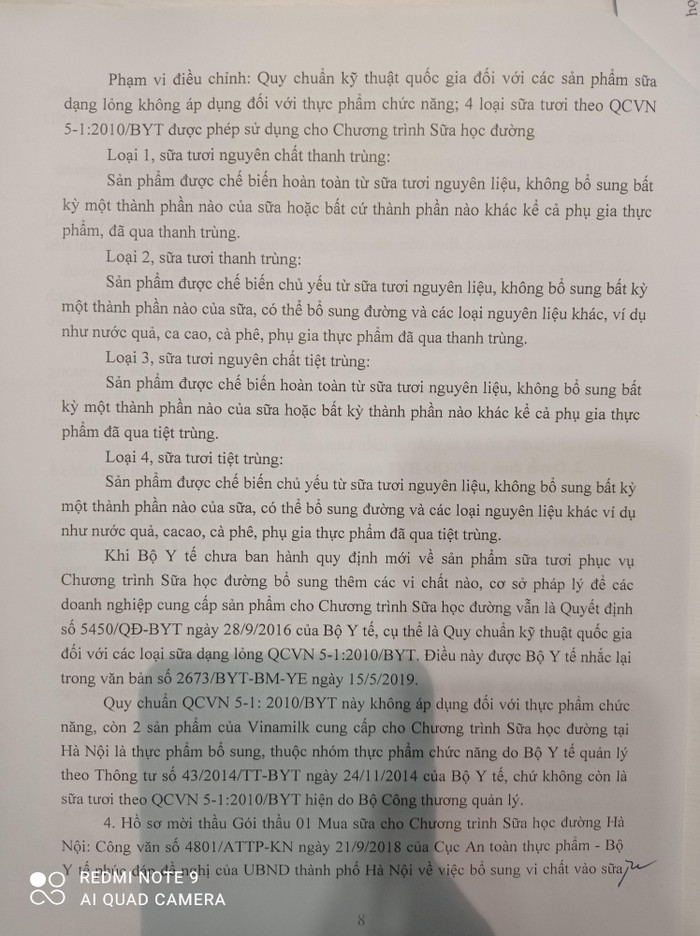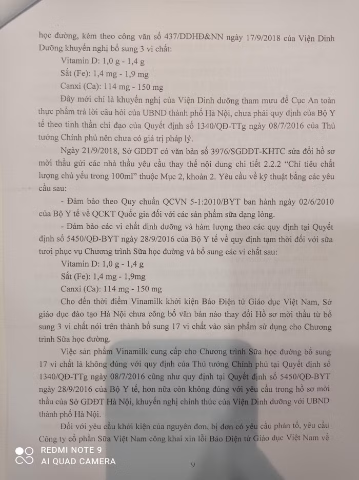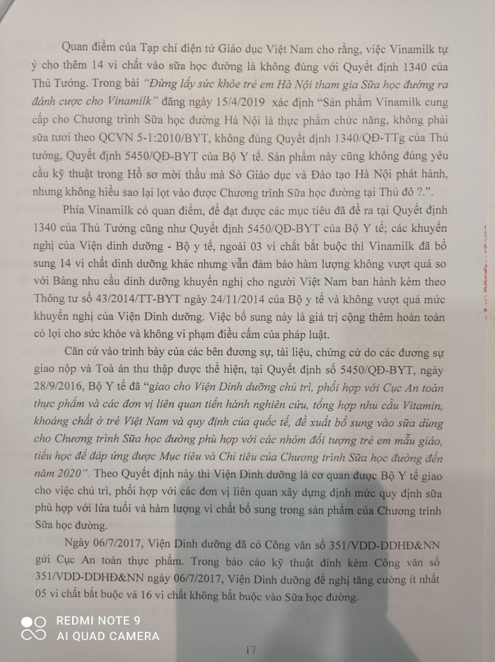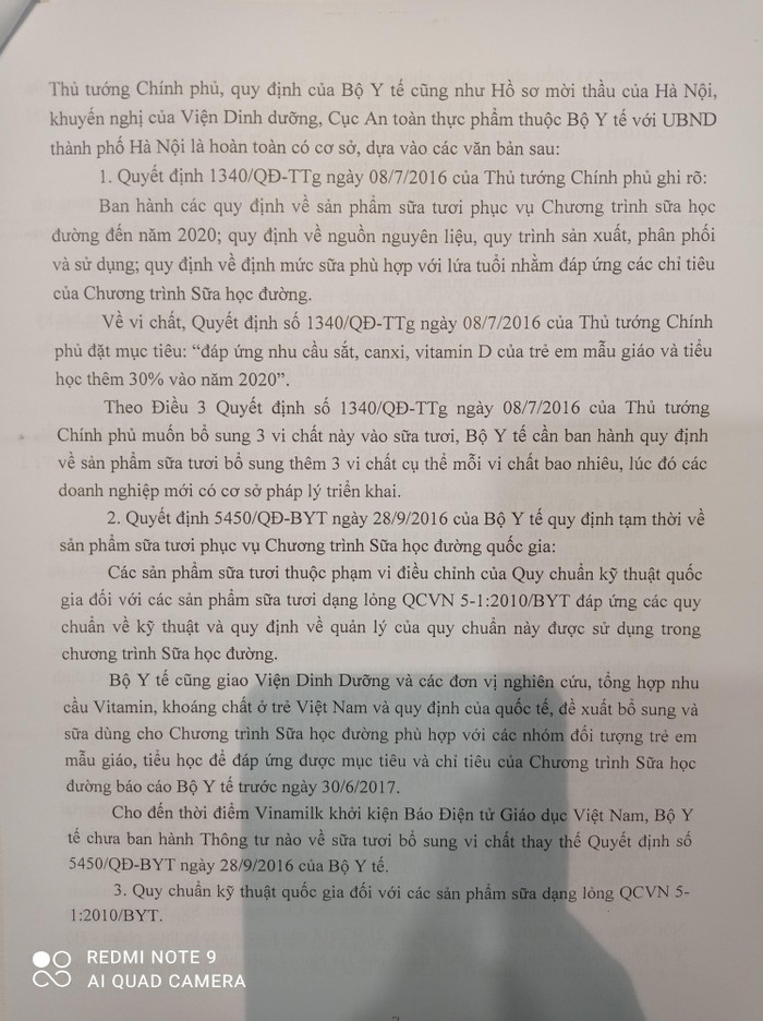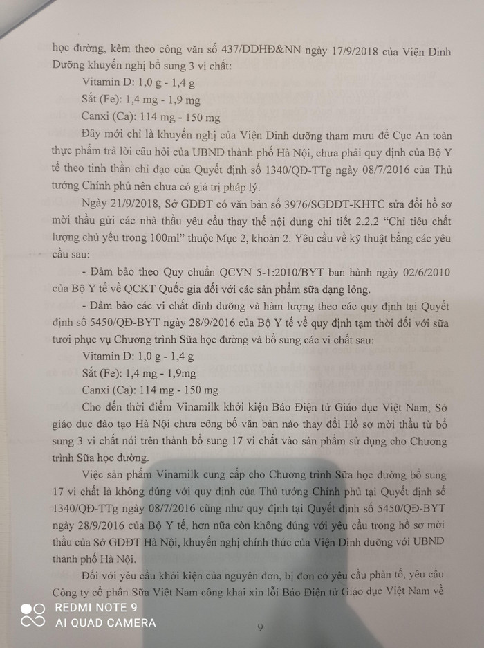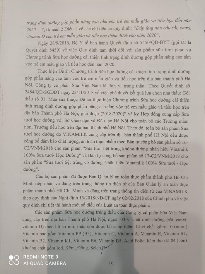 - Tại thời điểm Sở Giáo dục đào tạo mời thầu cũng chưa có cơ sở khoa học nào chứng minh việc Vinamilk bổ sung vi chất là tốt cho sức khỏe và đúng với mục đích phát triển tầm vóc trẻ em đến năm 2020;