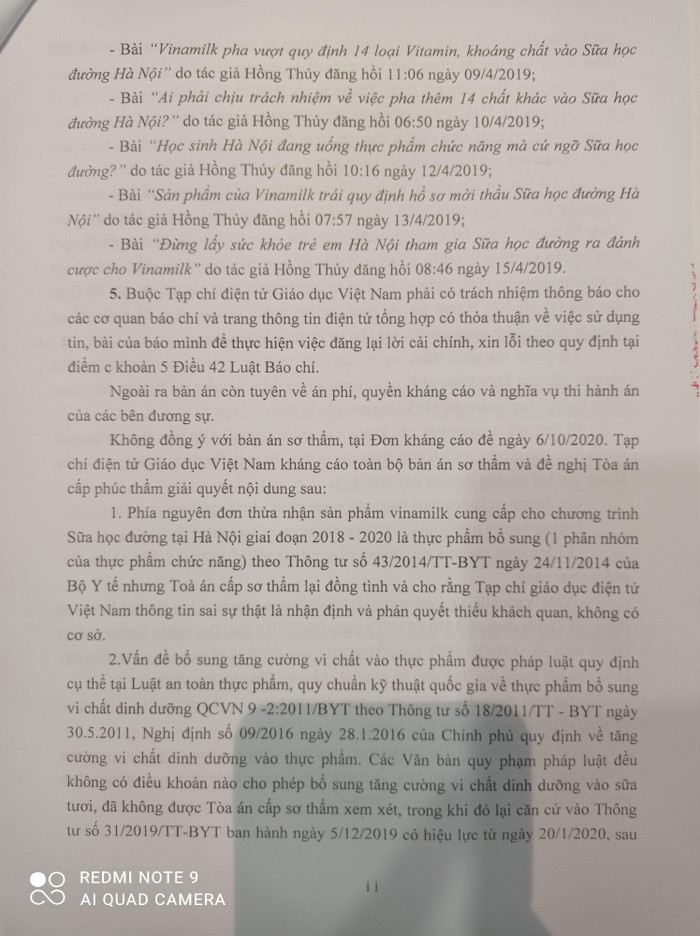 - Báo điện tử Giáo dục khi đăng các bài viết đã trích dẫn phát biểu của các nhà nghiên cứu cũng như ý kiến của các đại biểu xoay quanh việc Vinamilk bổ sung các vi chất có đúng quy định và đúng như hồ sơ mời thầu của Sở Giáo dục hay không là không có căn cứ, thông tin chưa được kiểm định tính chính xác và chưa được sự đồng ý của các nhà nghiên cứu, vi phạm quy trình tác nghiệp của phóng viên khi đăng bài theo Luật báo chí; không có căn cứ xác định chất lượng sản phẩm khi sử dụng có ảnh hưởng như thế nào đến sức khỏe của người tiêu dùng.