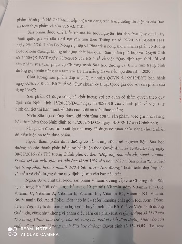 - Việc Vinamilk tự ý bổ sung các vi chất vào Sữa tươi học đường là không đúng với Quyết định số 1340/QĐ-TTg ngày 08/7/2016 của Thủ tướng Chính phủ và Quyết định số 5450/QĐ-BYT ngày 28/9/2016 của Bộ Y tế vì trong các văn bản này không có nội dung quy định cho bổ sung vi chất vào Sữa tươi học đường;