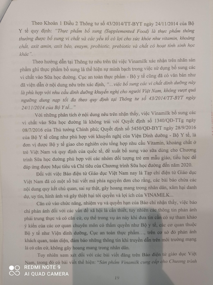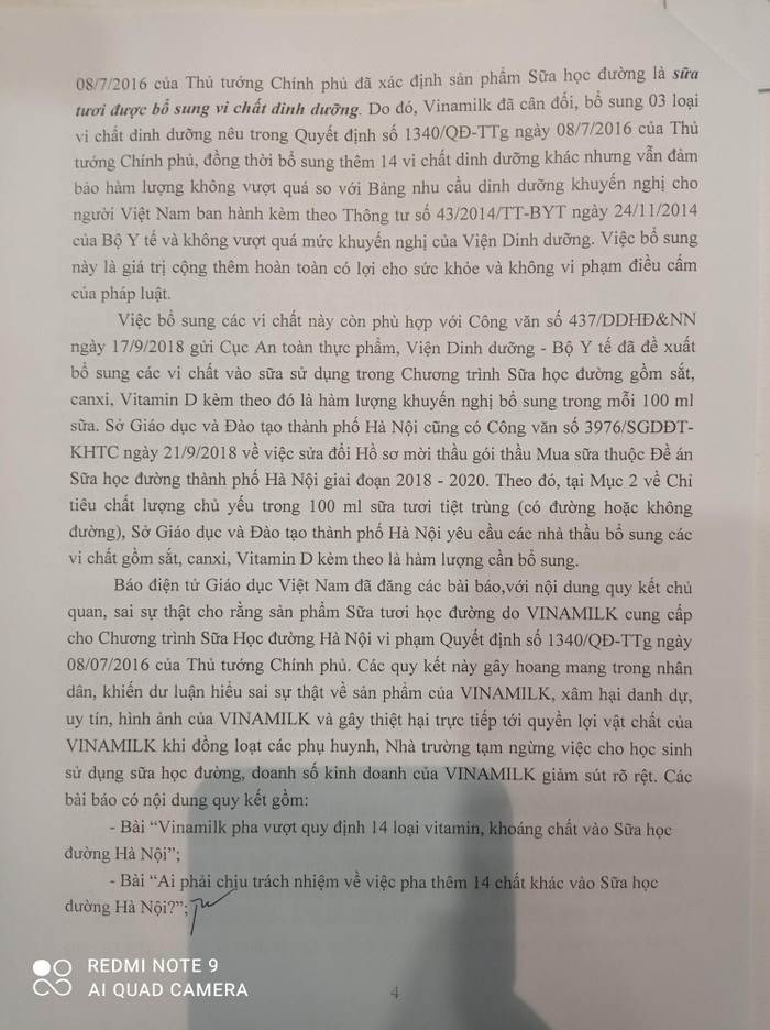 Tuy nhiên xem xét đối với các bài viết đăng trên Báo điện tử giáo dục Việt Nam, trong đó có bài viết thể hiện: “Sản phẩm Vinamilk cung cấp cho Chương trình Sữa học đường Hà Nội là sản phẩm chức năng, không phải sữa tươi theo QCVN 5 -1:2010/BYT, không đúng Quyết định 1340/QĐ – TTg của Thủ tướng, Quyết định 5450/QĐ-BYT của Bộ Y tế; không đúng yêu cầu kỹ thuật trong Hồ sơ mời thầu mà Sở Giáo dục và Đào tạo Hà Nội phát hành, nhưng không hiểu sao lại lọt vào được Chương trình Sữa học đường tại Thủ đô?”, cần xác định đây là những nhận định mang tính chủ quan, thiếu căn cứ khoa học và cơ sở pháp lý, không đúng sự thật khách quan, gây tâm lý hoang mang cho người tiêu dùng sản phẩm cũng như nhân dân, ảnh hưởng đến danh dự, uy tín và gây thiệt hại về kinh tế cho Doanh nghiệp.