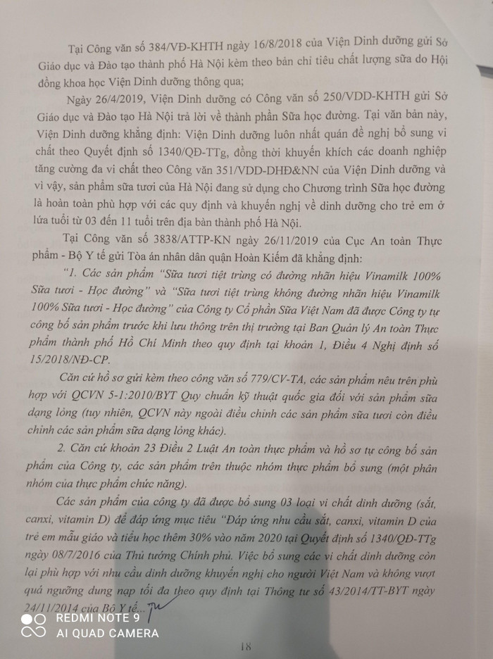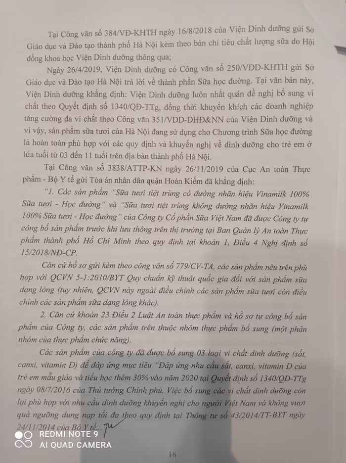 Ngày 26/4/2019, Viện Dinh dưỡng có Công văn số 250/VDD-HKTH gửi Sở Giáo dục và Đào tạo Hà Nội trả lời về thành phần Sữa học đường. Tại văn bản này, Viện Dinh dưỡng khẳng định: Viện Dinh dưỡng luôn nhất quán đề nghị bổ sung vi chất theo Quyết định số 1340/QĐ-TTg, đồng thời khuyến khích các doanh nghiệp tăng cường đa vi chất theo Công văn 351/VDD-DDHĐ&NN của Viện Dinh dưỡng và vì vậy, sản phẩm sữa tươi của Hà Nội đang sử dụng cho Chương trình Sữa học đường là hoàn toàn phù hợp với các quy định và khuyến nghị về dinh dưỡng cho trẻ em ở lứa tuổi từ 03 - 11 tuổi trên địa bàn thành phố Hà Nội.