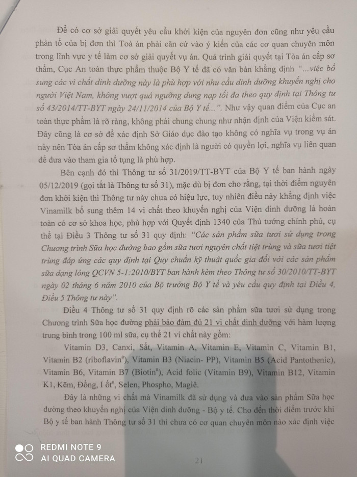 Bên cạnh đó thì Thông tư số 31/2019/TT-BYT của Bộ Y tế ban hành ngày 05/12/2019 ( gọi tắt là Thông tư số 31), mặc dù bị đơn cho rằng, tại thời điểm nguyên đơn khởi kiện thì Thông tư này chưa có hiệu lực, tuy nhiên điều này khẳng định việc Vinamilk bổ sung thêm 14 vi chất theo khuyến nghị của Viện dinh dưỡng là hoàn toàn có cơ sở khoa học, phù hợp với quyết định 1340 của Thủ tướng chính phủ, cụ thể tại Điều 3 Thông tư số 31 quy định: “Các sản phẩm sữa tươi sử dụng trong Chương trình Sữa học đường bao gồm sữa tươi nguyên chất tiệt trùng và sữa tươi tiệt trùng đáp ứng các quy định tại Quy chuẩn kỹ thuật quốc gia đối với các sản phẩm sữa dạng lỏng QCVN 5-1:2010/BYT ban hành theo Thông tư số 30/2010/TT-BYT ngày 02 tháng 6 năm 2010 của Bộ trưởng Bộ Y tế và yêu cầu quy định tại Điều 4, Điều 5 Thông tư này”.