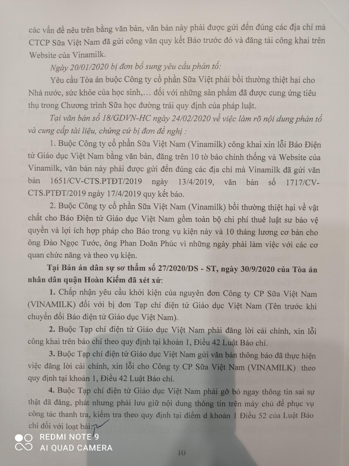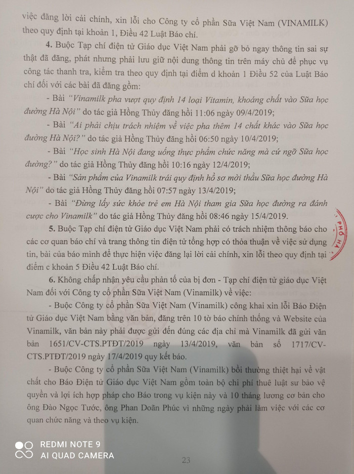 - Buộc Công ty cổ phần Sữa Việt Nam (Vinamilk) công khai xin lỗi Báo Điện tử Giáo dục Việt Nam bằng văn bản, đăng trên 10 tờ báo chính thống và Website của Vinamilk, văn bản này phải được gửi đến đúng các địa chỉ mà Vinamilk đã gửi văn bản 1651/CV-CTS.PTĐT/2019 ngày 13/4/2019, văn bản số 1717/CV-CTS.PTĐT/2019 ngày 17/4/2019 quy kết báo.