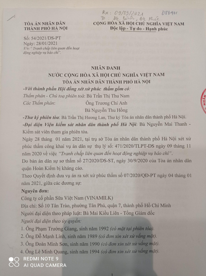 Ngày 28 tháng 02 năm 2021 tại trụ sở Tòa án nhân dân thành phố Hà Nội xét xử phúc thẩm công khai vụ án dân sự thụ lý số 471/2020/TLPT-DS ngày 09 tháng 11 năm 2020 về việc "Tranh chấp liên quan đến hoạt động nghiệp vụ báo chí".