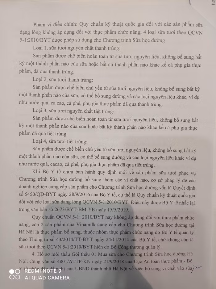 Quy chuẩn QCVN 5-1 :2010/BYT này không áp dụng đối với thực phẩm chức năng, còn 2 sản phẩm của Vinamilk cung cấp cho Chương trình sữa học đường tại Hà Nội là thực phẩm bổ sung, thuộc nhóm thực phẩm chức năng do Bộ Y tế quản lý theo Thông tư số 43/2014/TT-BYT ngày 24/11/2014 của Bộ Y tế, chứ không còn là sữa tươi theo QCVN 5-1 :2010/BYT hiện do Bộ Công thương quản lý.