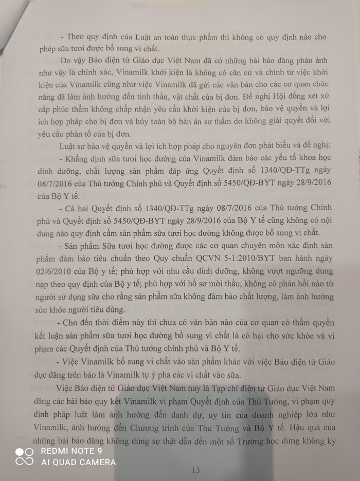 Do vậy Báo điện tử Giáo dục Việt Nam đã có những bài báo đăng phản ánh như vậy là chính xác, Vinamilk khởi kiện là không có căn cứ và chính từ việc khởi kiện của Vinamilk cũng như việc Vinamilk đã gửi các văn bản cho các cơ quan chức năng đã làm ảnh hưởng đến tinh thần, vật chất của bị đơn. Đề nghị Hội đồng xét xử cấp phúc thẩm không chấp nhận yêu cầu khởi kiện của bị đơn, bảo vệ quyền và lợi ích hợp pháp cho bị đơn và hủy toàn bộ bản án sơ thẩm do không giải quyết đối với yêu cầu phản tố của bị đơn.