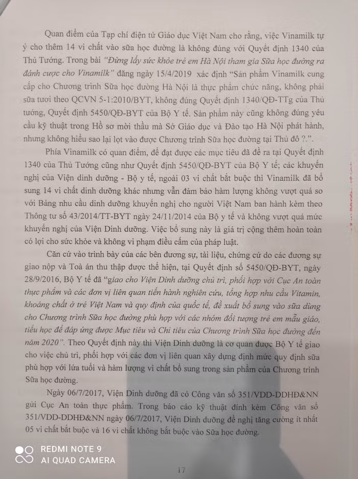 Phía Vinamilk có quan điểm, để đạt được các mục tiêu đã đề ra tại Quyết định 1340 của Thủ tướng cũng như Quyết định 5450/QĐ-BYT của Bộ Y tế; các khuyến nghị của Viện dinh dưỡng - Bộ Y tế, ngoài 03 vi chất bắt buộc thì Vinamilk đã bổ sung 14 vi chất dinh dưỡng khác nhưng vẫn đảm bảo hàm lượng không vượt quá so với Bảng nhu cầu dinh dưỡng khuyến nghị cho người Việt Nam ban hành kèm theo Thông tư số 43/2014/TT-BYT ngày 24/11/2014 của Bộ y tế và không vượt quá mức khuyến nghị của Viện Dinh dưỡng. Việc bổ sung này là giá trị cộng thêm hoàn toàn có lợi cho sức khỏe và không vi phạm điều cấm của pháp luật.
