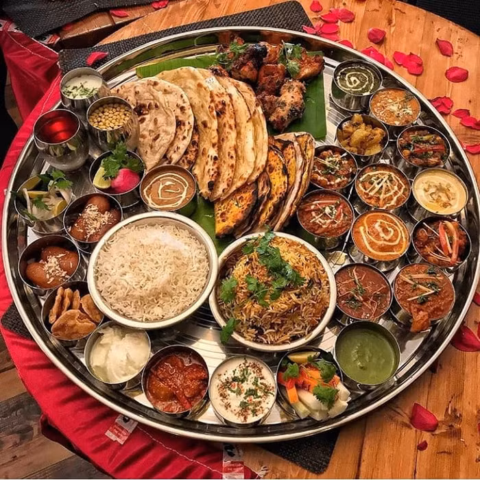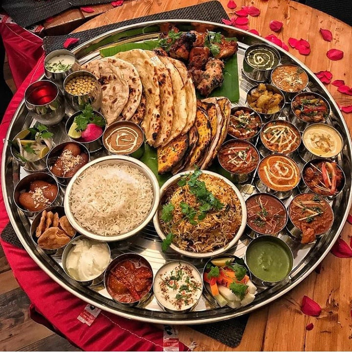 Trong đó, Thali là món ăn hỗn hợp gồm cơm, bánh mì naan, cà ri đậu, khoai tây, sữa chua không đường và một vài nguyên liệu khác để tạo thêm hương vị. Thali được đặt chung trên một chiếc khay với tất cả nguyên liệu, vừa bắt mắt vừa kích thích vị giác của từng thực khách.