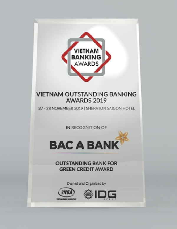| BAC A BANK vinh dự nhận giải thưởng Ngân hàng tiêu biểu về Tín dụng xanh 2019 trong khuôn khổ Giải thưởng Ngân hàng Việt Nam tiêu biểu (VOBA). |