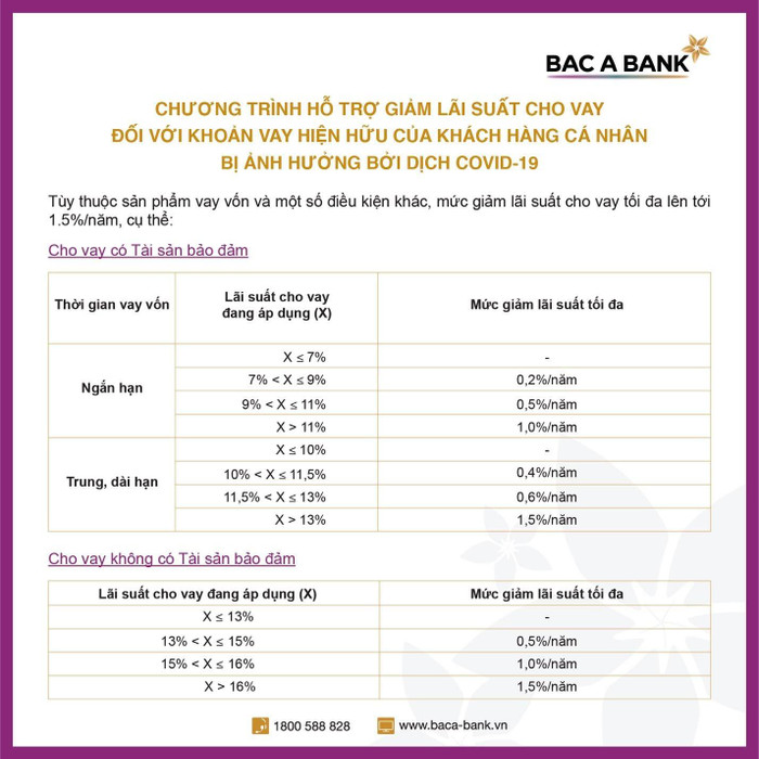 Đây là chương trình giảm lãi lớn của BAC A BANK trong năm 2021 với tổng hạn mức lên đến 5.000 tỷ đồng, thời gian hỗ trợ lãi suất tối đa 3 tháng đối với Khoản vay trung dài hạn, tối đa 2 tháng với với Khoản vay từ 6 tháng đến 12 tháng và tối đa 1 tháng đối với Khoản vay ngắn hạn dưới 6 tháng.