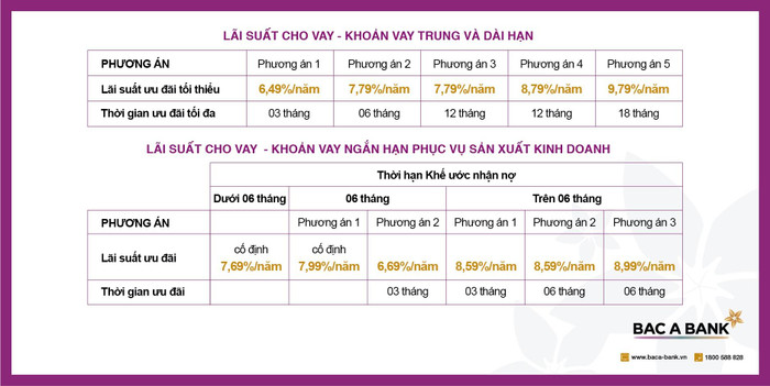 Bên cạnh đó, để hỗ trợ tối đa cho Khách hàng, với các khoản vay ngắn hạn phục vụ sản xuất kinh doanh, BAC A BANK cũng nới rộng thời gian hưởng ưu đãi tối đa lên tới 6 tháng. Đáng chú ý, các khoản vay dưới 6 tháng được áp dụng mức lãi suất cố định - chỉ 7,69% /năm.