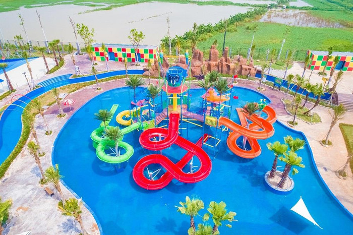 Hệ thống trò chơi công viên nước có 4 đường ống trượt, bể tạo sóng, bể sục nước và bể lặn cùng các trò chơi mạo hiểm dưới nước.