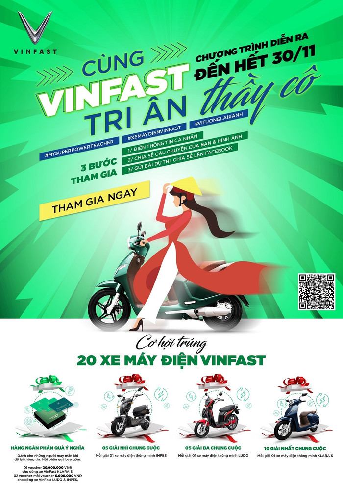 Cuộc thi này nằm trong chuỗi chương trình “Cùng VinFast tri ân Thầy Cô”, hướng tới kỉ niệm Ngày Nhà giáo Việt Nam 20/11. Nhân dịp này, VinFast dành tặng các Thầy Cô giáo trên khắp mọi miền đất nước món quà tri ân ý nghĩa là hộp quà tặng đặc biệt gồm 01 phiếu mua xe máy điện Klara-S trị giá 20 triệu đồng và 02 phiếu mua xe Impes, Ludo trị giá 6,6 triệu đồng.