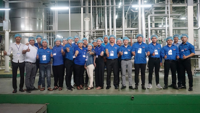 Sau khi lắng nghe giới thiệu thông tin về Tập đoàn và thực hiện quy trình vệ sinh khử khuẩn an toàn tại nhà máy, hơn 80 cán bộ đoàn viên thanh niên cùng cán bộ của đoàn đã tham quan trực tiếp hệ thống dây chuyền công nghệ chiết lạnh vô trùng Aseptic.