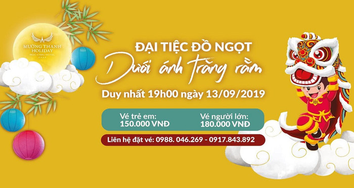 Cùng phá mâm cỗ siêu to khổng lồ với các loại bánh ngọt, chè, thạch, trái cây.. .và đồ uống đặc sắc. Cùng thưởng thức màn múa lân, ảo thuật độc đáo, văn nghệ hấp dẫn, trò chơi vui nhộn. Duy nhất 19h00 ngày 13/09/2019. Vé trẻ em: 150.000 đồng; vé người lớn: 180.000 đồng Liên hệ đặt vé: 0988. 046.269 - 0917.843.892 Mường Thanh Holiday Huế - DẠ TIỆC BUFFE TRĂNG RẰM Thưởng thức dạ tiệc buffet Trăng Rằm với hơn 30 món Á Âu đặc sắc. Thời gian: 18:00 đến 20:30 ngày 13/09/2019 Giá: 180.000 đồng (miễn phí trẻ em dưới 1m) Địa điểm: Phòng tiệc An Hòa - tầng trệt Liên hệ đặt bàn: 0234 393 6688 hoặc 0989120887Nội dung |